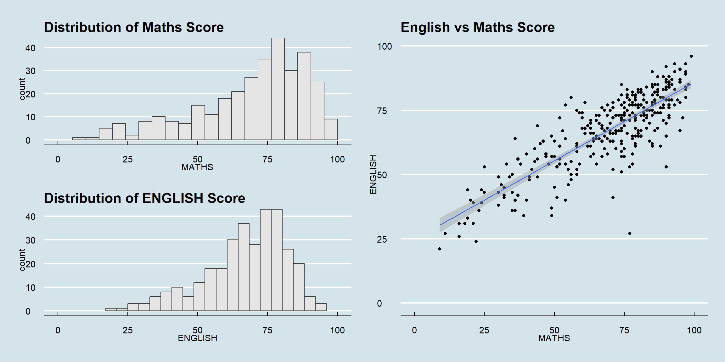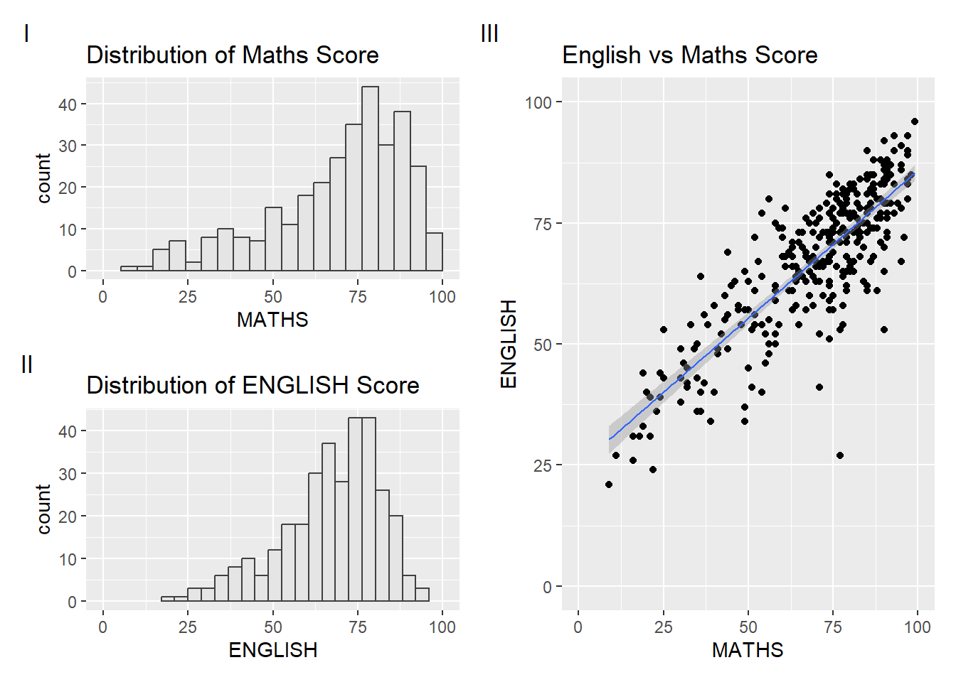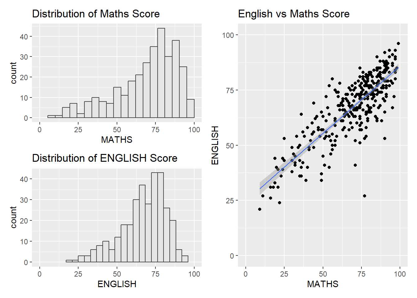 p1 <- ggplot(data=exam_data, aes(x=MATHS)) + geom_histogram(bins=20, boundary=100, color='grey25',fill='grey90')+coord_cartesian(xlim=c(0,100)) + ggtitle('Distribution of Maths Score')p2 <- ggplot(data=exam_data, aes(x=ENGLISH)) + geom_histogram(bins=20, boundary=100, color='grey25',fill='grey90')+coord_cartesian(xlim=c(0,100)) + ggtitle('Distribution of ENGLISH Score')p3 <- ggplot(data=exam_data, aes(x=MATHS, y=ENGLISH))+ geom_point()+ geom_smooth(method=lm,linewidth=0.5)+coord_cartesian(xlim=c(0,100),ylim=c(0,100))+ggtitle('English vs Maths Score')Combining Graphs