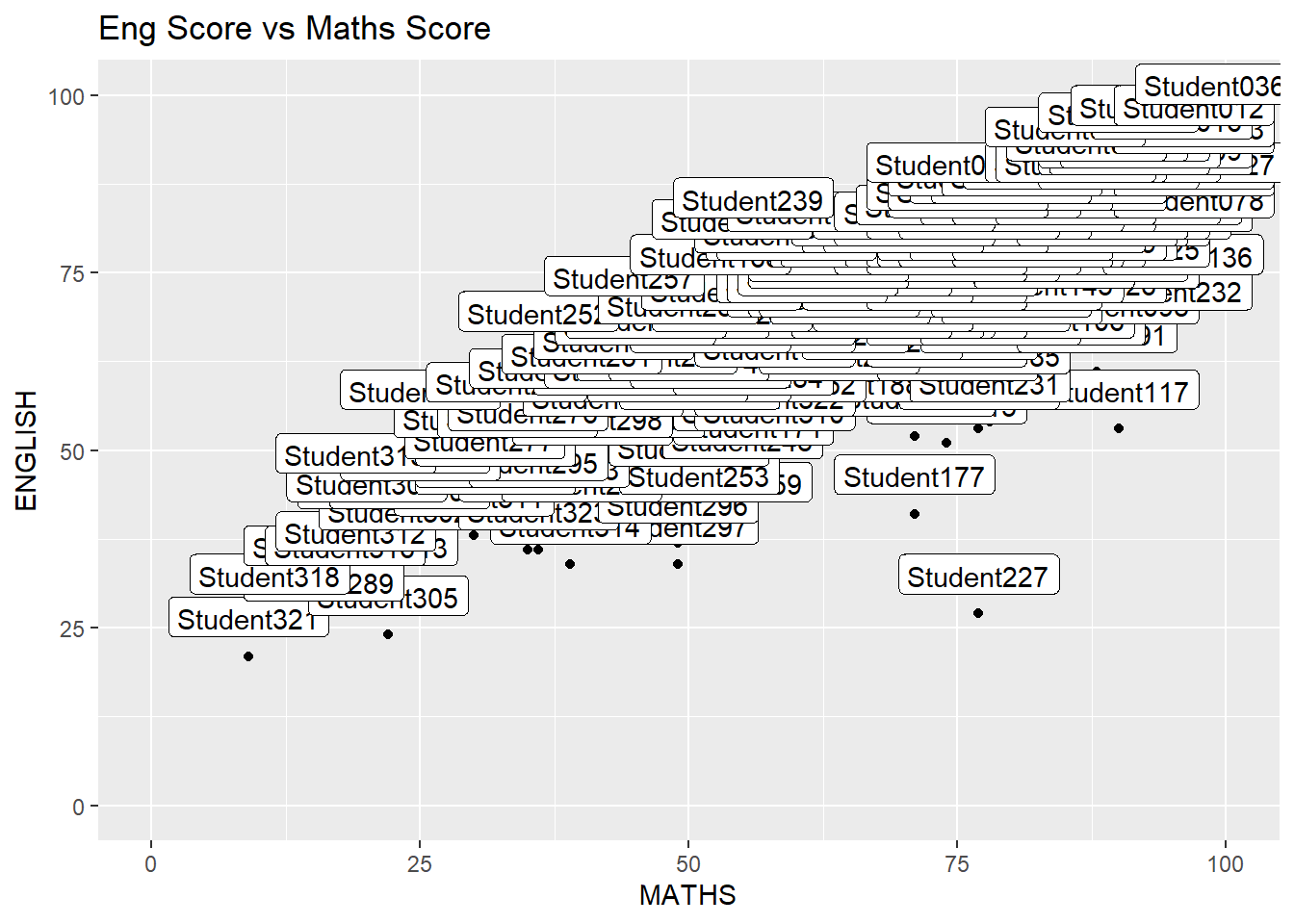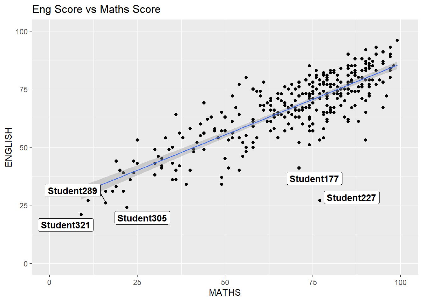 ggplot(data=exam_data,aes(x=MATHS,y=ENGLISH))+geom_point()+geom_smooth(method=lm,size=0.5)+geom_label_repel(aes(label=ID),fontface='bold')+coord_cartesian(xlim=c(0,100),ylim=c(0,100))+ggtitle('Eng Score vs Maths Score')