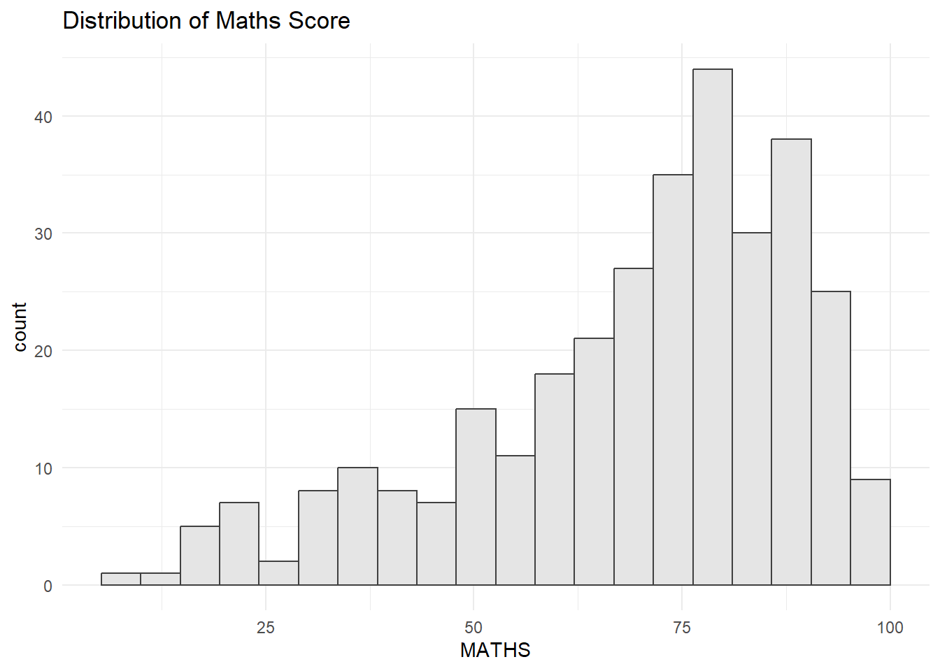 ggplot(data=exam_data, aes(x=MATHS))+ geom_histogram(bins=20,boundary=100,color='grey25',fill='grey90')+theme_minimal()+ggtitle('Distribution of Maths Score')