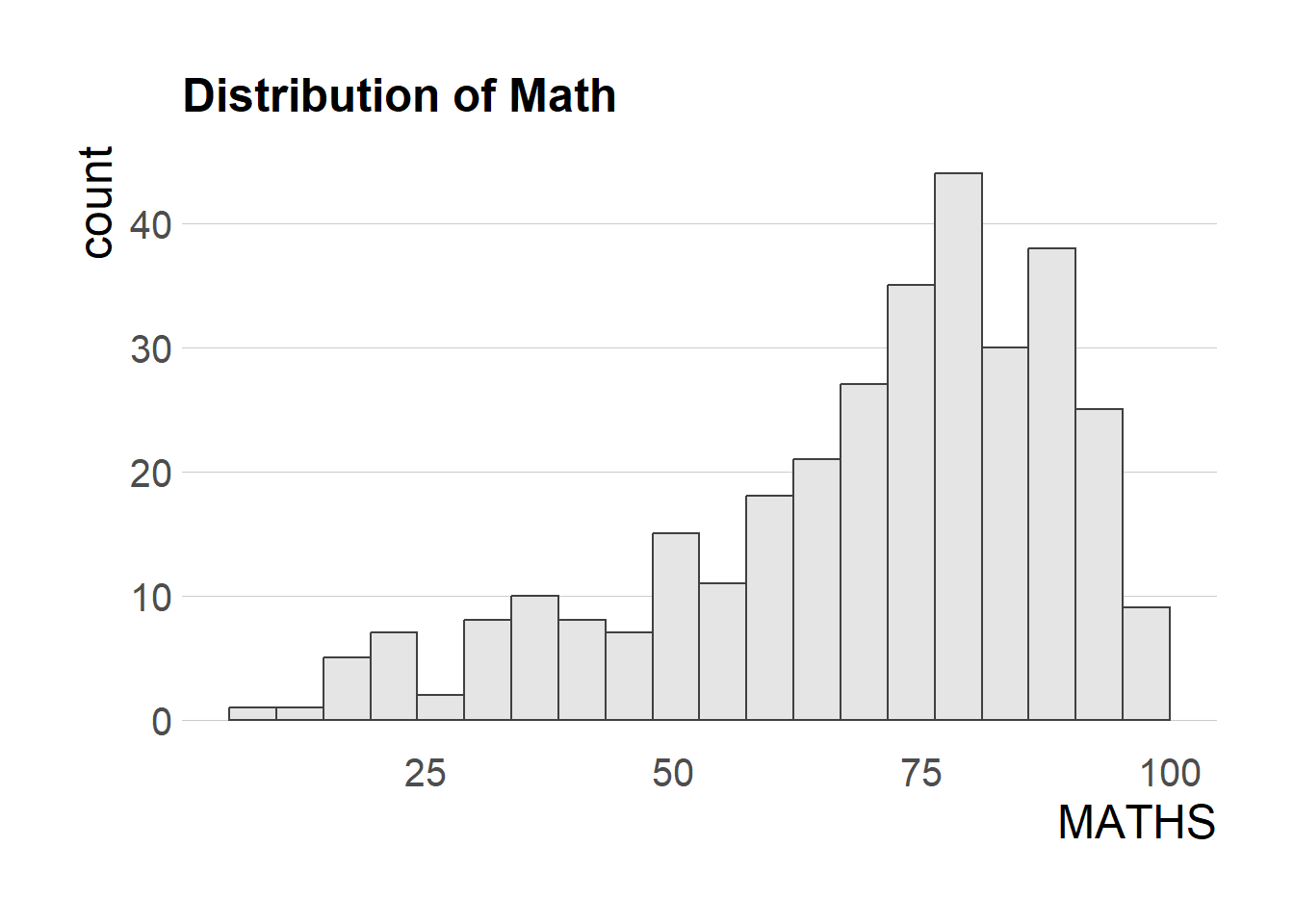 ggplot(data=exam_data, aes(x=MATHS)) + geom_histogram(bins=20,boundary=100,color="grey25", fill="grey90")+ggtitle('Distribution of Math')+theme_ipsum_es(axis_title_size = 18, base_size = 15, grid = "Y")